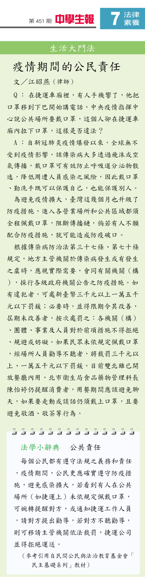 「中學生報專欄」疫情期間的公民責任 江昭燕律師
