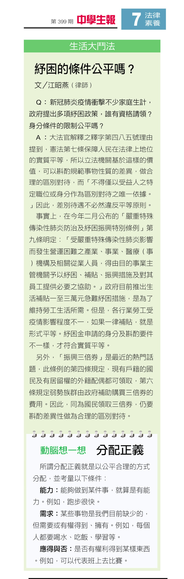 「中學生報專欄」紓困條件公平嗎? 江昭燕律師