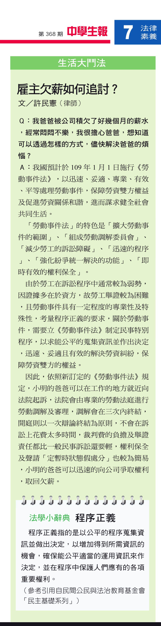 「中學生報專欄」「如何向雇主討積欠的薪水?」程序正義-許民憲律師