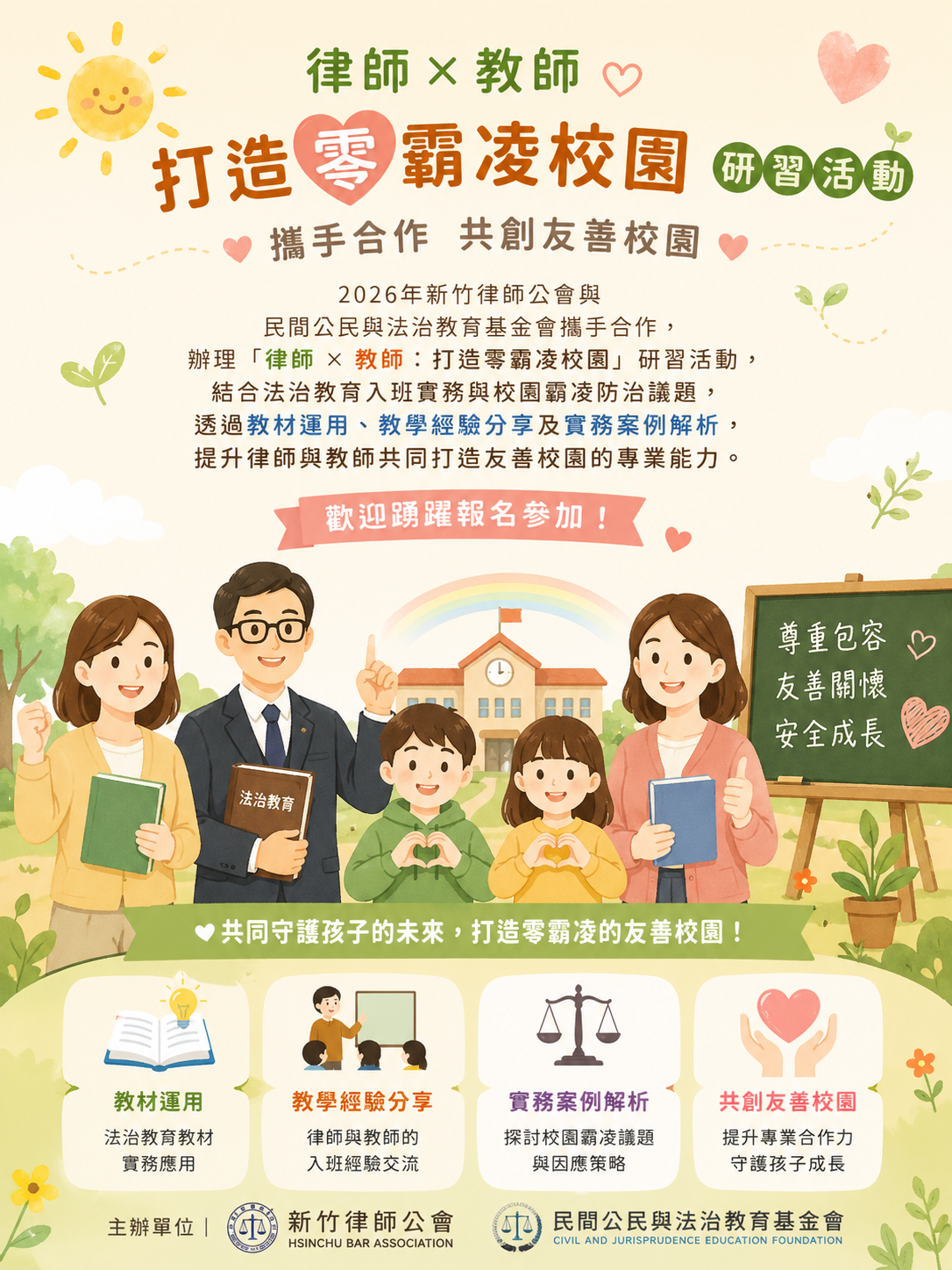 基金會與新竹律師公會共同舉辦【法治教育種子律師培訓「律師×教師:打造零霸凌校園」研習】活動。結合法治教育入班實務與校園霸凌防治議題,透過教材運用、教學經驗分享及實務案例解析,提升律師與教師共同打造友善校園的專業能力。歡迎踴躍報名參加!